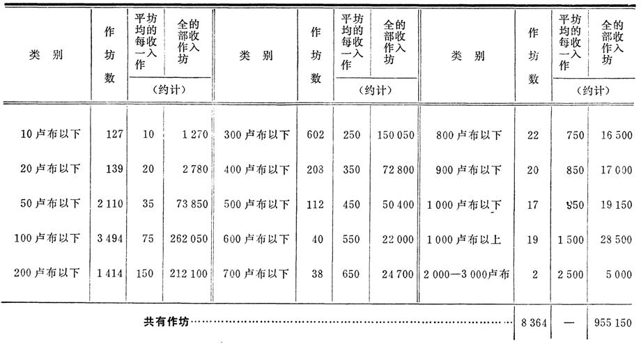 | 按工人总数划分的作坊类别 | 作坊数 | 工人数 | 有雇佣工人的作坊数 | 它们的百分比 | 每个作坊所有的工人 | ||||