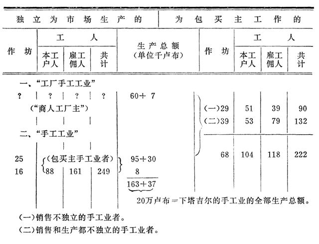 《概述》作者为了证实所谓大作坊没有重要意义这一见解,他们引用了下列事实:在手工业者的雇佣工人中年工很少(8%),大多数是计件工(37%)、季节工(30%)和日工(25%,第51页)。计件工“通常在自己家里做工,用自己的工具,吃自己的饭”,而日工则象农业工人一样,是“暂时”招雇的。在这种情况下,“我们认为雇佣工人较多并不标志着这些作坊就一定是资本主义类型的作坊”(第56页)……“根据我们的信念,不论是计件工或日工,都根本不能造成西欧无产阶级那样的工人阶级基干;只有固定的年工才能成为这样的基干。”