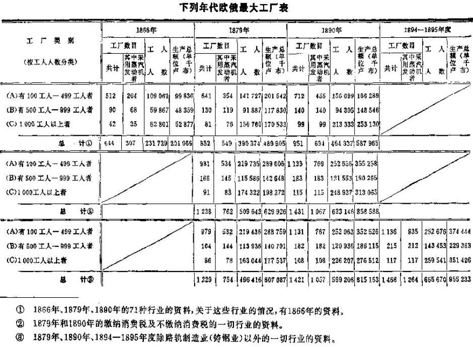 (105) 资料来源:《财政部年鉴》第1编(只有71种行业的资料);《工厂一览表》,第1版和第3版,有一切行业的资料,正如在《工厂索引》中一样;但是,为了把《工厂索引》的资料与《工厂一览表》的资料作一比较,必须从列入《工厂一览表》清单的行业中除去路轨制造业。那些把家庭工人也列入工厂工人的作坊,已经被减去。这种把家庭工人列入的情形,有时候在上述出版物的注释中直接讲明了;这种情形有时候可以从各年资料的比较中看出来:例如,参看1879年、1890年以及1894―1895年度萨拉托夫省棉织业的资料(参看第6章第2节(1))。辛茨海梅尔(《论德国大工厂生产扩张的限度》1893年斯图加特版)把有50个工人以上的工厂企业归入大工厂企业。我们认为这个标准绝对不低,但是由于计算俄国资料很困难,所以只得限于最大的工厂了。