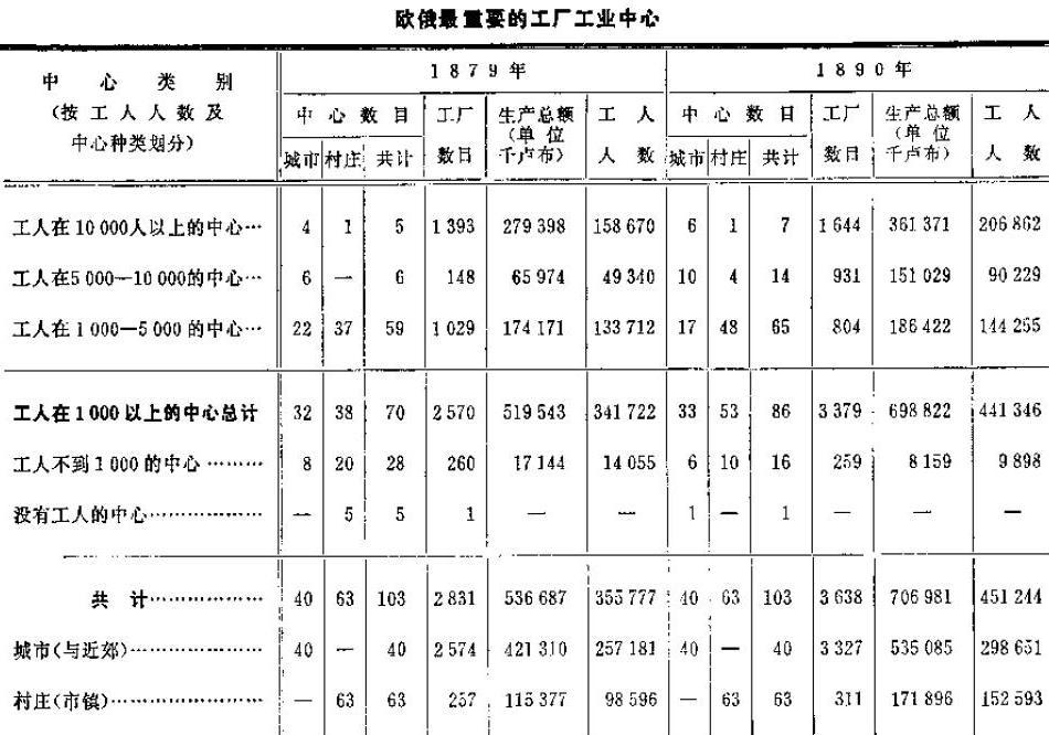 | 1908年(俄罗斯66省) 工厂数目―工人人数 [工厂类别] 5403―63954 [工人在20以下者] 4569―152408 [21―50工人者] 2112―15 0888 [51―100工人者] 2169―496329 [101―500工人者] 433―28 0369 [501―1000工人者] 299―66 3891 [超过1000工人者] 14985―1808109 [共计] 工厂有100工人以上者 1908年 1903年 工厂数目 工人人数 工厂数目 工人人数 2901―1440859 2737―1261363 |