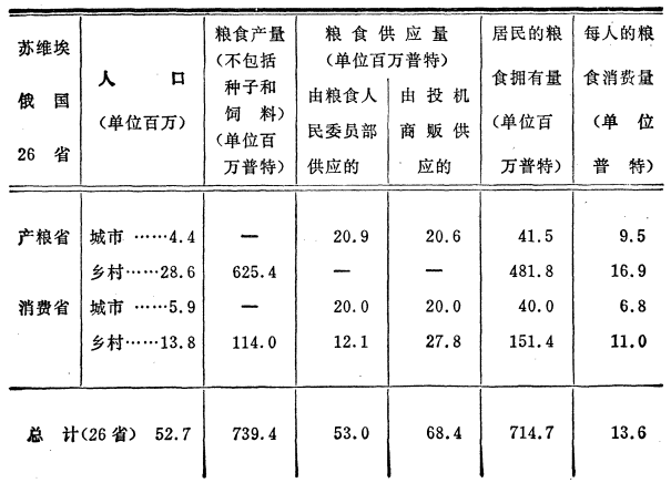 在我们所经历的这个短时期内,在我们所处的世界上空前未有的困难条件下,我们究竟在多大程度上战胜了资本主义,从下述总结数字中就可以看出来。中央统计局刚刚整理了一份关于苏维埃俄国26个省(不是全国)粮食生产情况和消费情况的统计材料,准备发表。