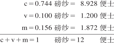 正如纱中存在的每一个要素c,v,m都能再分割为相同的各个组成部分一样,价值1先令=12便士的每一磅纱也可以分割为: