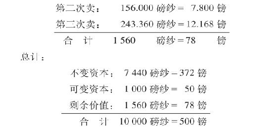 最后,他还能把余下的价值78镑的1 560磅纱,在卖出以后,照如下方式分割开来:用卖出的价值58.032镑的1 160.640磅纱,补偿1 560磅纱中所包含的生产资料的价值,用卖出的价值7.800镑的156磅纱,补偿可变资本的价值。合计1 316.640磅纱=65.832镑,补偿全部资本价值;最后,243.360磅剩余产品=12.168镑留做收入花费。