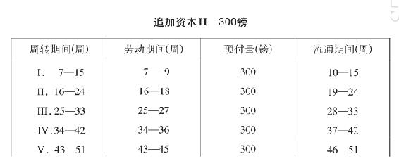 第一个周转期间12周。第一个劳动期间9周,其中预付资本的周转,在第13周开始时完成。最后3周有追加资本300镑执行职能,并且开始第二个9周的劳动期间。