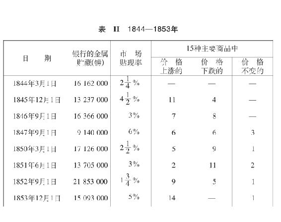 “如同1834—1843年的10年中一样,在1844—1853年,银行存金的变动,每次都伴有在贴现上贷出的货币的借贷价值的增加或减少;而另一方面,国内商品价格的变动则表明,它和英格兰银行存金的变动所显示出来的通货量完全无关。”(《银行法报告》,1857年第2部分第290、291页)