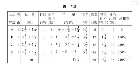 总地租下降到低于第一次投资的地租水平(表XI)的情形,只有在下述情况下才是可能的:A级土地和B级土地都退出竞争,C级土地起调节作用并且变为无租土地。