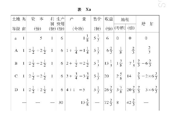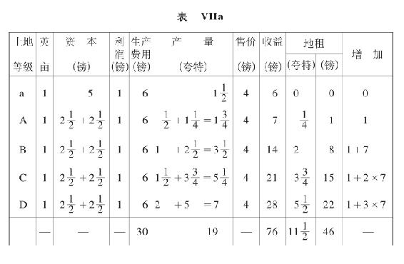 我们假定有这样一种土地(我们用a来表示)参加竞争。因此,那个一向无租的土地A也将提供地租,于是以上的表VII、表VIII和表X,将取得如下的形式: