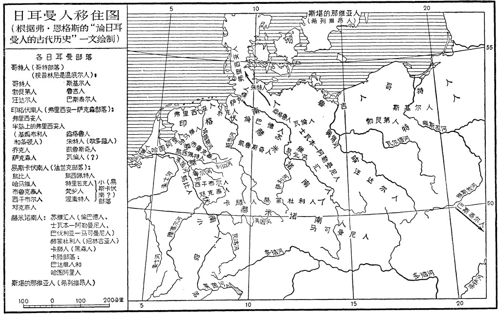 但是,当我们从普林尼的体系出发时,必须拒绝无条件地利用塔西佗的三位一体说,否认关于曼奴斯的三个儿子印格、易斯克和赫明的古代神话。第一,塔西佗自己根本不知道怎样处理印格伏南人、易斯卡伏南人和赫米诺南人;他丝毫没有想把他列举出来的各个民族纳入这三个基本部落。第二,以后也没有一个人做成这件工作。措伊斯拚命要把他认为是“易斯泰伏南人”的哥特民族塞到那个三位一体说中去,因而造成了更大的混乱。他从来没有打算把斯堪的那维亚人包括在这里面,他把他们构成为第四个基本部落。但是这样一来,三位一体说就垮台了,正像普林尼的五个基本部落使它垮台一样。