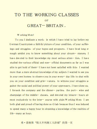 我献给你们一本书。在这本书里,我想把你们的状况、你们的苦难和斗争、你们的希望和要求的真实情况描绘给我的德国同胞们。我曾经在你们当中生活过一个相当长的时期,对你们的状况有足够的了解。我非常认真地研究过你们的状况,研究过我所能弄到的各种官方的和非官方的文件,但是我并不以此为满足。我寻求的并不仅仅是和这个题目有关的抽象的知识,我愿意在你们的住宅中看到你们,观察你们的日常生活,同你们谈谈你们的状况和你们的疾苦,亲眼看看你们为反抗你们的压迫者的社会的和政治的统治而进行的斗争。我是这样做了。我抛弃了社交活动和宴会,抛弃了资产阶级的葡萄牙红葡萄酒和香槟酒,把自己的空闲时间几乎都用来和普通的工人交往;对此我感到高兴和骄傲。高兴的是这样一来我在获得实际生活知识的过程中有成效地度过了许多时间,否则这些时间也只是在客厅里的闲谈和讨厌的礼节中消磨掉;骄傲的是这样一来我就有机会为这个受压迫受诽谤的阶级做一件应该做的事情,这些人尽管有种种缺点并且处于重重不利的地位,但仍然引起每个人的尊敬,也许只有英国的锱铢必较的商人才是例外;还值得骄傲的是这样一来我就能保护英国人民,使他们不致日益受人鄙视。而来自欧洲大陆的这种鄙视,正是你们国家的当权的资产阶级极端自私自利的政策和全部行为的必然后果。