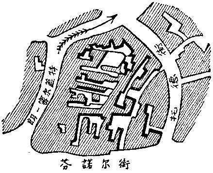 还要补充一下的,就是几乎所有的厂房都是沿着贯串全城的三条河流和各种运河建立起来的,现在我就来描述工人区本身的情形。首先要谈的是曼彻斯特旧城,它位于商业区北边和艾尔克河之间。这里的街道,即使像托德街、朗-密尔盖特、威色-格罗弗和修德希尔这些比较好的街道,也都是又狭窄又弯曲的,房屋又肮脏又破旧,胡同里的建筑更是令人作呕。如果从老教堂顺着朗-密尔盖特街走去,就会看到右边有一排老式房屋,这些房屋的门面没有一间不是东倒西歪的,——这是旧曼彻斯特,工业时代以前的曼彻斯特的残迹,以前住在这里的居民和他们的子孙都搬到本城建筑得较好的区域去了,而把这些对他们太不合适的房屋留给包括很多爱尔兰人在内的工人居民。这里才真正是一个几乎毫不掩饰的工人区,甚至大街上的商店和酒馆也没有人想把它们的外表弄得稍微干净一些。但是这一切和后面那些只有经过狭窄得甚至不能同时走两个人的过道才能进去的胡同和大杂院比起来简直就算不了什么。像这样违反合理的建筑术的一切规则而把房子乱七八糟地堆在一起,弄得一所贴着一所地挤作一堆,实在是不能想像的。而且这不能只怪建筑物是旧曼彻斯特时代保存下来的。这种杂乱无章的情形只是在最近才达到顶点,现在,在任何地方,只要那里的建筑方式比较古老因而还保留下那么一点点空隙,人们就在这里补盖起房子,把这个空隙填起来,直到房子和房子之间连一小块可以再建筑一些东西的空地也没有为止。我现在从曼彻斯特的平面图上描下一小块来证实我的话。这远不是最坏的一块地方,而且占地还不到整个旧城的十分之一。