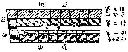 后来出现了另一种建筑形式,这种形式现在已普遍地采用了。现在,工人小宅子几乎再也不一所所地盖了,总是一盖就是几十所,甚至几百所;一个业主一下子就盖它一整条或两三条街。这些街道排列如下:第一排是比较高级的小宅子,很幸运,这些小宅子有一个后门和一个小院子,因而房租也最贵。这些小宅子的院子通向一条两端都盖有房子的弄堂(back-street),其中一端有一条窄缝或有顶的过道通到这条弄堂里去。大门开在弄堂里的那些小宅子,房租最便宜,一般也照管得最坏。它们和第三排小宅子共用一堵后墙,第三排小宅子的门开在另一条街上,房租比第一排便宜,但比第二排贵。这样,街道的布置情况就约略如下图: