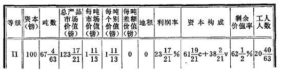 至于Ⅱ,这里产品的[实际]价值也等于120镑等等。但是因为每吨个别价值等于1+(11/13)镑(或24/13镑),所以这个等级生产65吨(因为120除以24/13等于65)。简单地说,我们在这里得到的是第574页上的A表。但是因为在这里我们需要有几个新项目来适应我们的目的,所以当出现Ⅰ这个等级而产品市场价值提高到2镑时,我们就要为这第三种场合制一个新表。