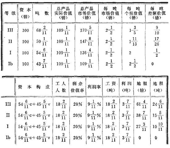 但是,因为Ⅲ的每吨个别价值等于1+(3/5)镑(或8/5镑),所以Ⅲ生产[109+(1/11)]∶(8/5),即68+(2/11)吨(换句话说,这里109+(1/11)镑等于68+(2/11)吨)。其次,每吨市场价值和每吨个别价值的差额现在是2+(1/2)镑减1+(3/5)镑,或者说,2镑10先令减1镑12先令,即18先令。以68+(2/11)吨计算,就是[68+(2/11)]×18先令=1227+(3/11)先令=61+(4/11)镑。Ⅲ的产品不是卖109+(1/11)镑,而是卖170+(5/11)镑。这个余额就是Ⅲ的地租。用吨来表示,地租=24+(6/11)吨。