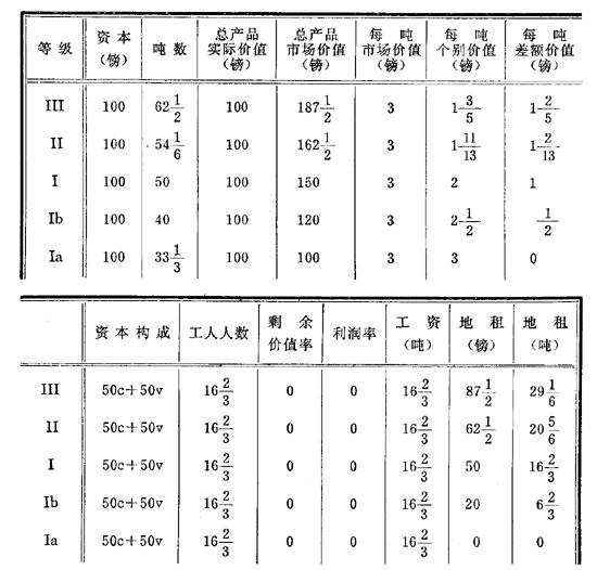 只有等级Ⅰa,为了补偿不变资本和工资,确实需要有33+(1/3)吨或夸特的实物,即需要全部总产品,因而事实上既没有剩余价值,也没有剩余产品,既没有利润,也没有地租。如果情况不是这样,如果得到的产品比以实物形式补偿资本所必需的多,就会发生利润(剩余价值)和资本向地租的转化。只要以前在价值较低时本来必须用来补偿资本的那部分产品中有一部分现在游离出来,或者本来必须转化为资本和剩余价值的那部分产品现在归入地租份内,在这里就会发生这种转化。