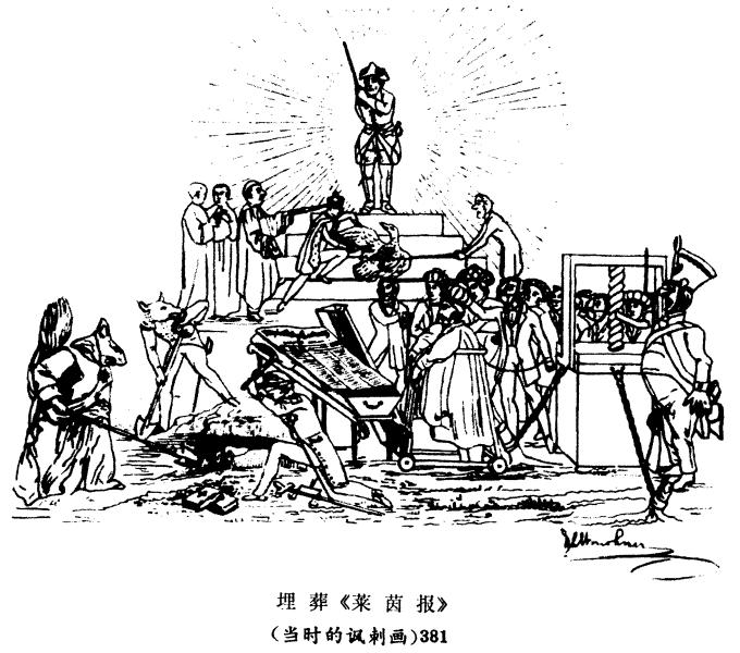 381 漫画是在政府下令查封《莱茵报》之后画的。前列画的三个掘墓人是主管书报检查的三个大臣:宗教事务、教育和卫生大臣艾希霍恩被画为穿着僧侣法衣的松鼠(见注31),司法大臣米勒带有司法的象征——天平、剑和蒙在眼睛上的布带,还有内务大臣冯·阿尔宁。放在棺材上的是《莱茵报》,周围是戴着嘴套和镣铐的比喻性的人物,象征着反对派报刊。——第508―509页之间。