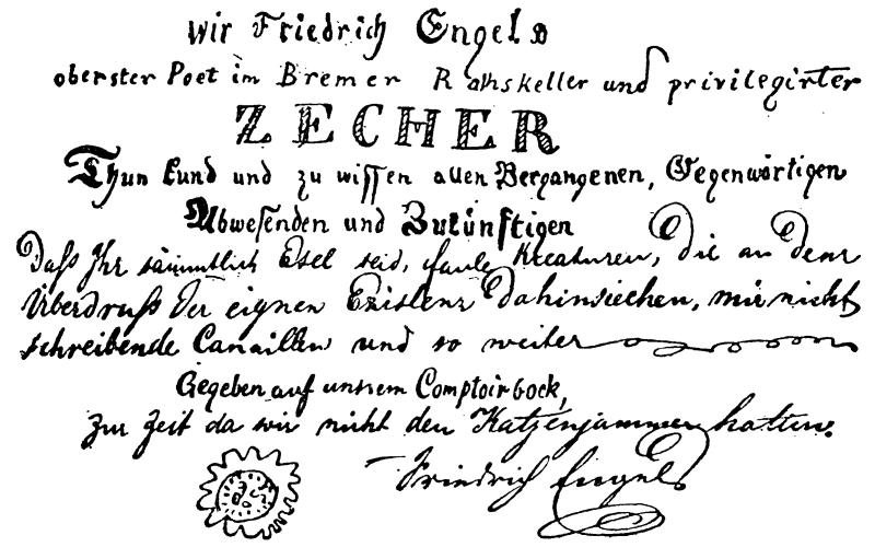 FN1 下面复制了原稿中的一段戏言:“敝人,弗里德里希·恩格斯,不来梅市政厅酒家大诗人,享有特权的醉汉,向全体过去的、现在的、缺席的和未来的人们郑重宣布:你们都是蠢驴,懒虫,都是因自己本身存在的空虚而萎靡不振的家伙,不给我写信的坏蛋,如此等等。敝人酒醒时谨书于商行柜台。弗里德里希·恩格斯。”——编者注