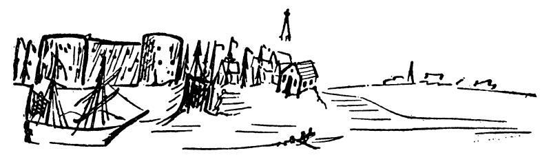 这是不来梅港的素描。左边是护港舰队,一幢不久就会被风掀掉的旧砖房,旁边是放船入港的闸门。这是一条狭长的河道,比乌培河略宽。在河道那边是城市,右面稍远一点是盖斯特河,它象一条小溪,河边矗立着钟楼的尖顶,这是仍在建筑中的教堂。右面远处的盖斯滕多夫隐约可见。