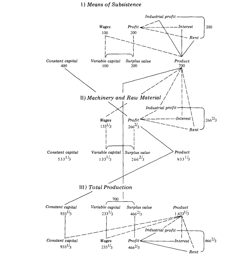 The variable capital of 133 1/3 is paid out in wages (money), and 133 1/3 is drawn with this money from the total product of class I. Thus 133 1/3 of the money of class II flows to class I, and products to the same value flow from class I to class II. The surplus value of 266 2/3 is paid in money as interest and rent, and a quantity of the products of class I is bought with this money. This sum of money together with the money that has flowed back from the wages, interest and rent of class I and the wages of class II is more than sufficient to provide class I with the 400 in money needed to replace class I's constant capital of 400 and to allow class II to draw means of subsistence from the total product of class I for its industrial profit. The result is that the whole of the product [of class] I has passed into the consumption fund, and 400 of the total product of class II has passed into class I in replacement of its constant capital, but class II, on the other hand, needs 533 1/3 for the replacement of its own constant capital.